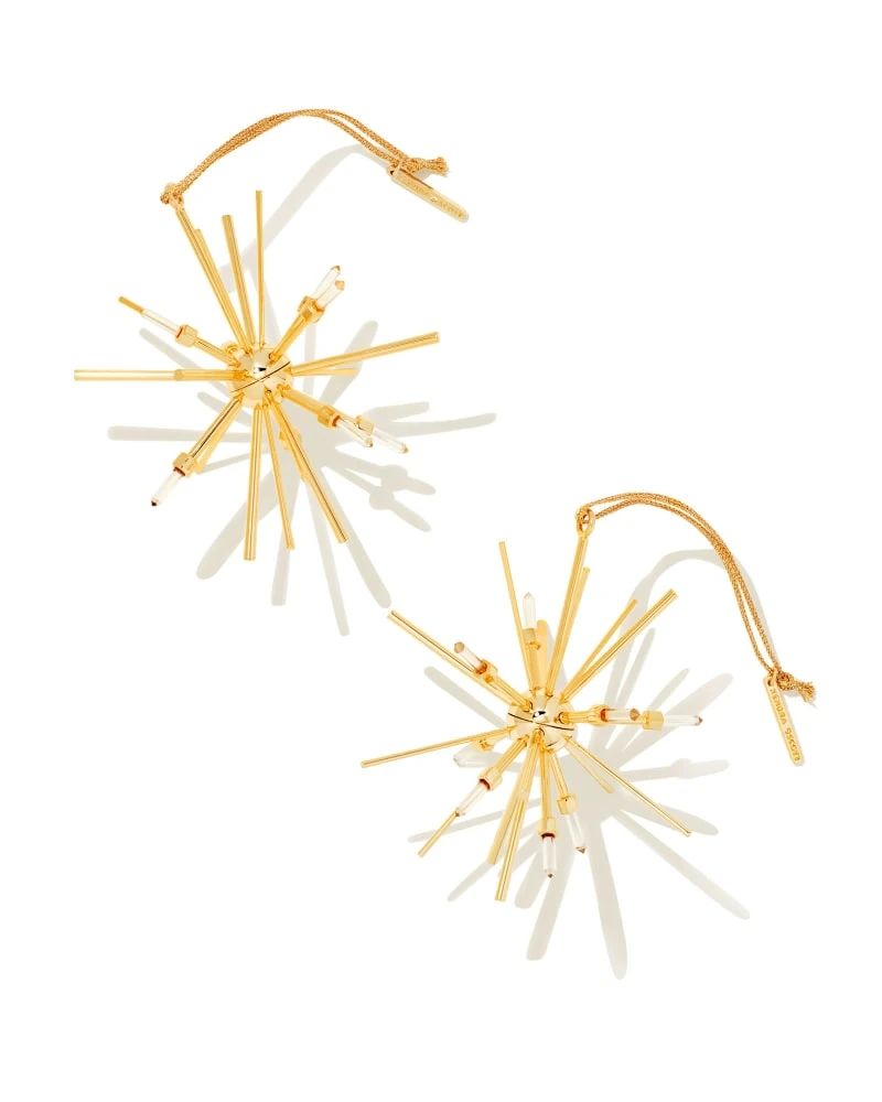 Give the gift of shine this season with the Starburst Gold Ornaments Set of 2 in Clear! Fitting for everyone on your nice list, this joyful pair of ornaments is a thoughtful gift perfect for trimming the tree or mantle.
